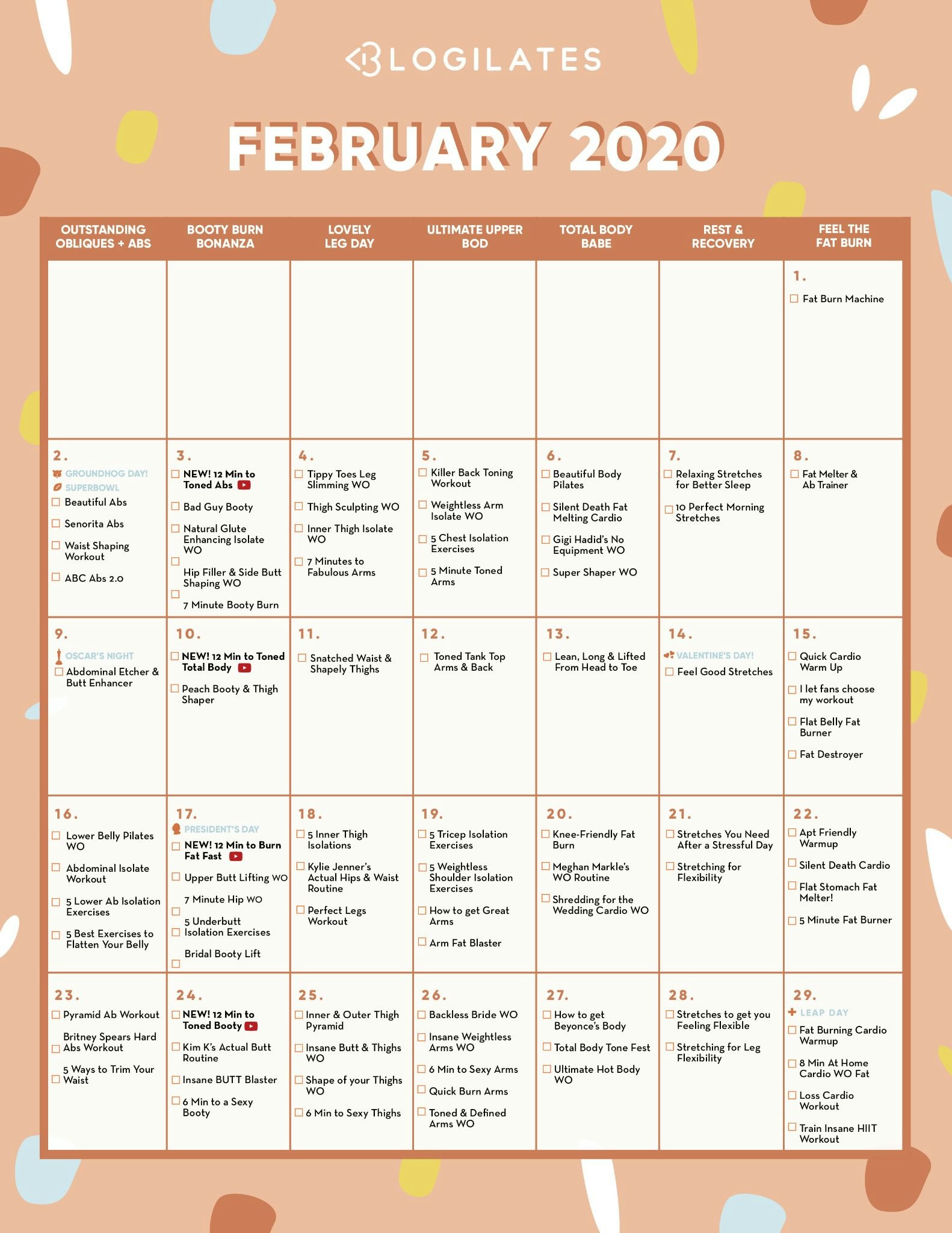 The guide includes a month long calendar as well as a printable weekly checklist. Follow along in the body by blogilates app to access all of the workouts in one place. New february workouts 561 metabolic w/ kara 34 mins 562 kickboxing intervals w/ shannon 35. Each day you will be tasked with completing a set of exercises, with an.